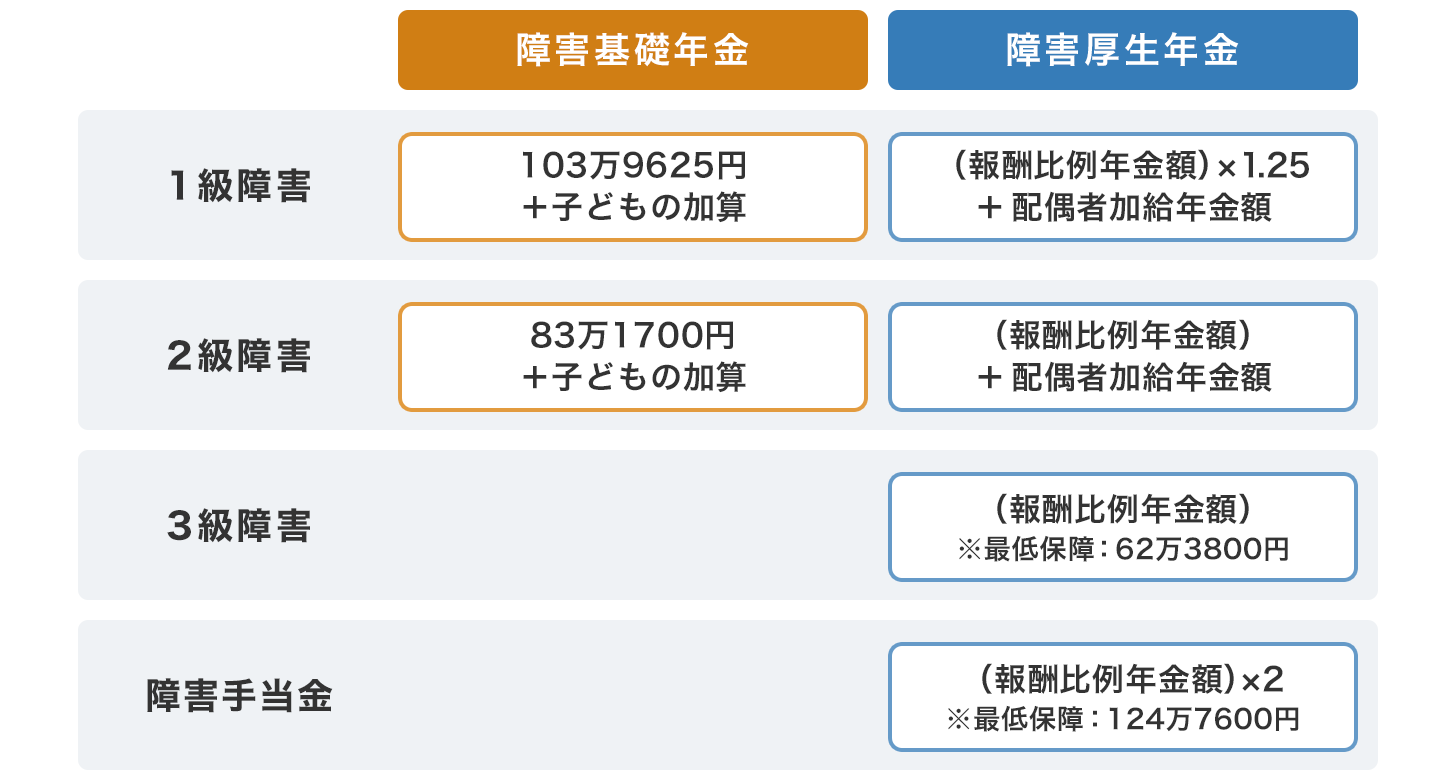 国民年金の加入者であれば「障害基礎年金」が支給され、厚生年金の加入者であれば、障害基礎年金にプラスして「障害厚生年金」も支給されます。