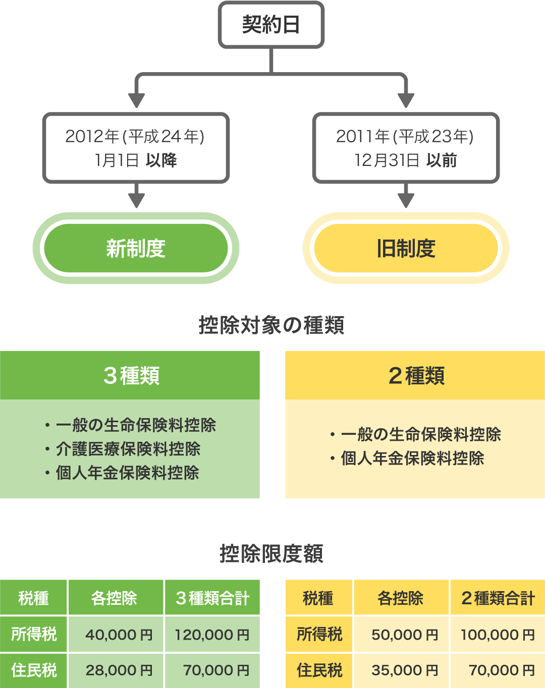生命保険料控除には保険の契約日によって新制度と旧制度に分かれ、具体的に、2012年(平成24年)1月1日以降の契約は新制度、2011年(平成23年)12月31日までに結んだ保険契約は旧制度となります。
