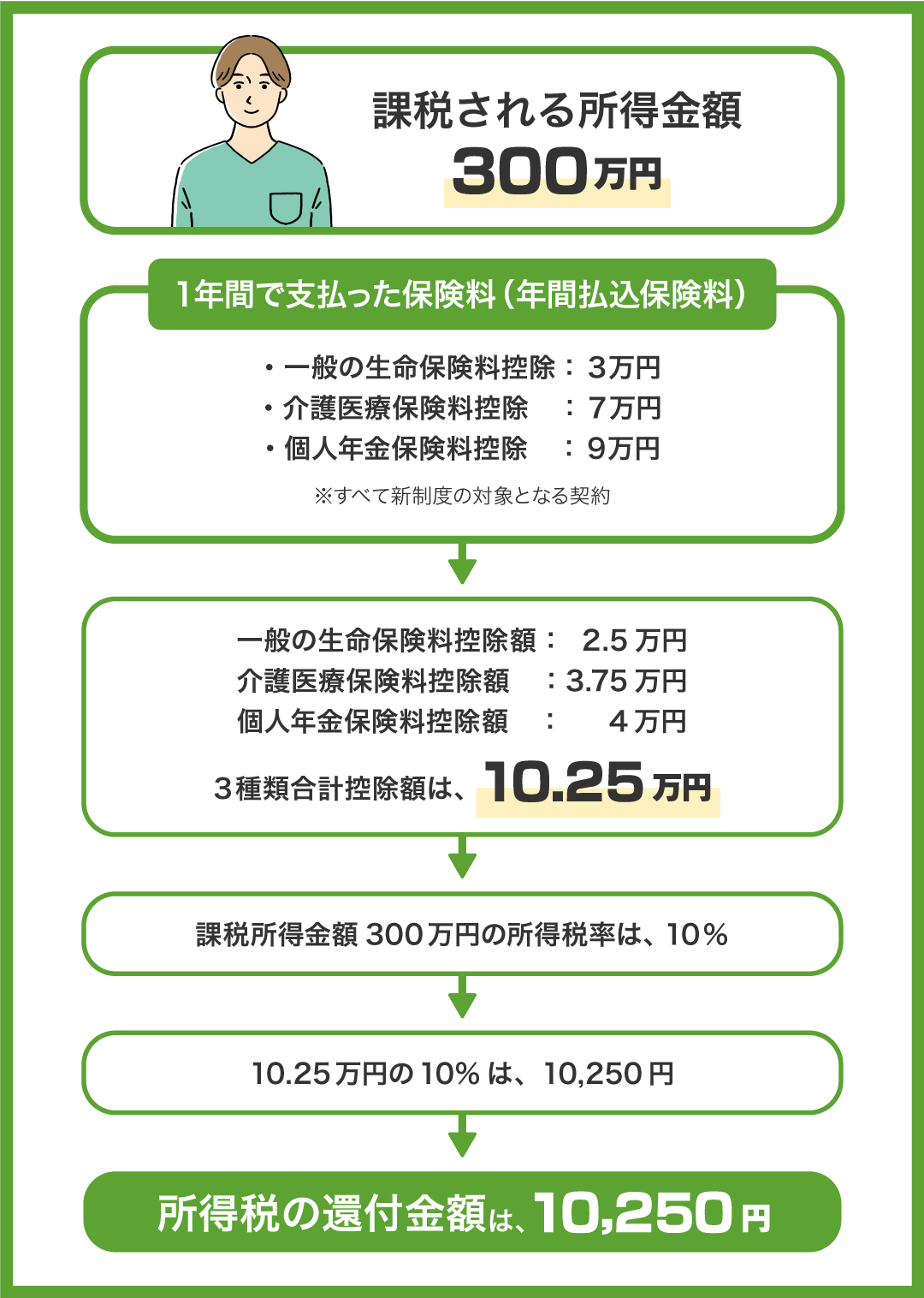 なお、図6では、課税される所得金額(課税所得)が300万円、年間払込保険料額が一般の生命保険料3万円、介護医療保険料7万円、個人年金保険料9万円だった場合の、還付金額の例です。