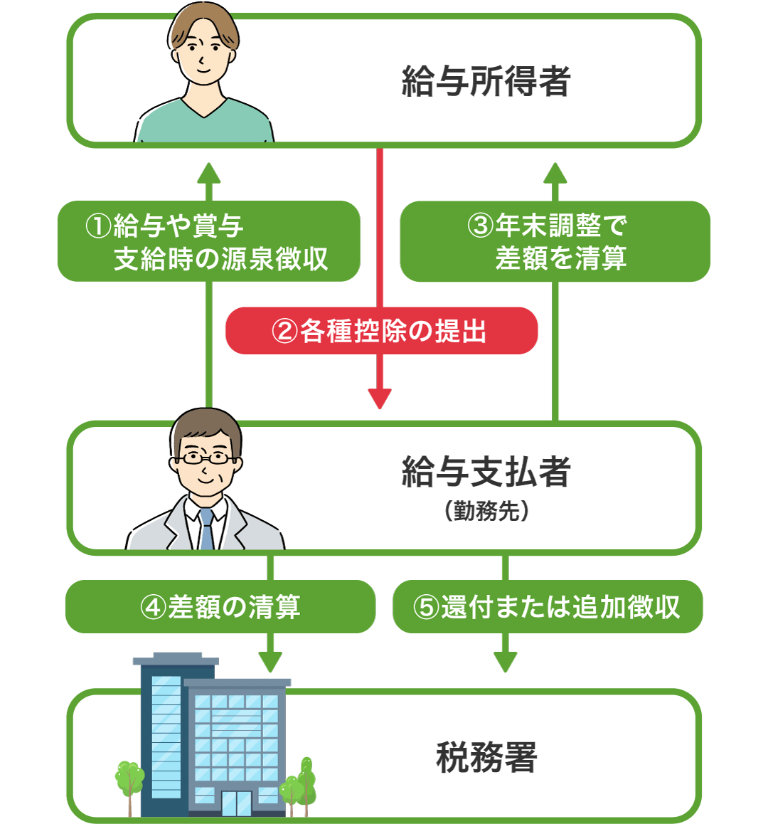 一般的に、給与所得者は勤務先で年末調整を行います。年末調整で還付を受けるまでの流れは、下の図7のとおりです。