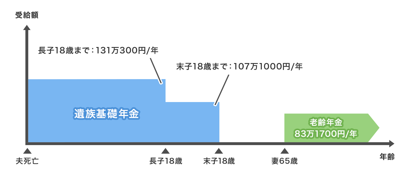 | 妻65歳以降の期間 | 妻の老齢基礎年金 | 遺族厚生年金+妻の老齢基礎年金 | |||