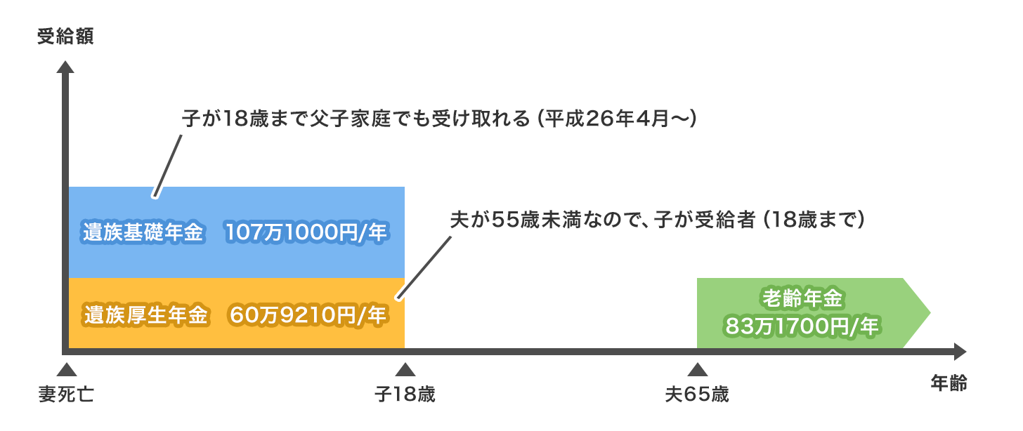 ただし、55歳以上かつ遺族基礎年金を受け取っている夫は、60歳の前でも遺族厚生年金を受け取れます。
