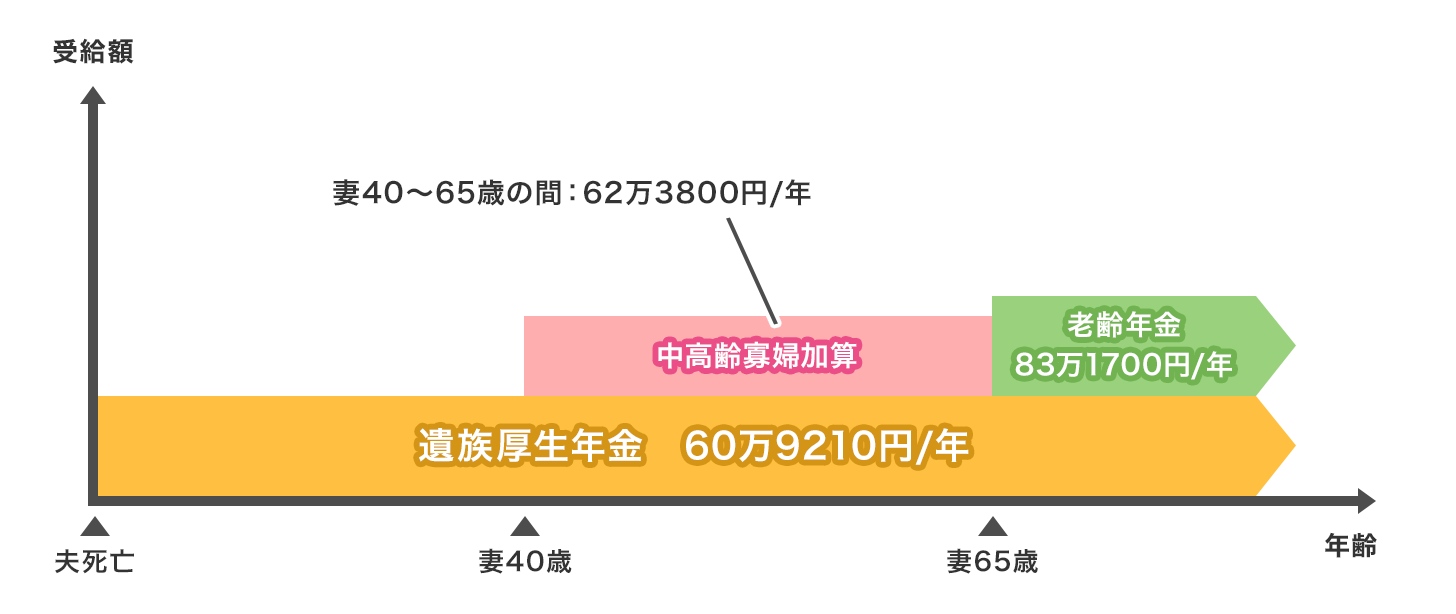 | 妻40〜64歳の期間 | 0円 | 遺族厚生年金+中高齢寡婦加算 | |||
