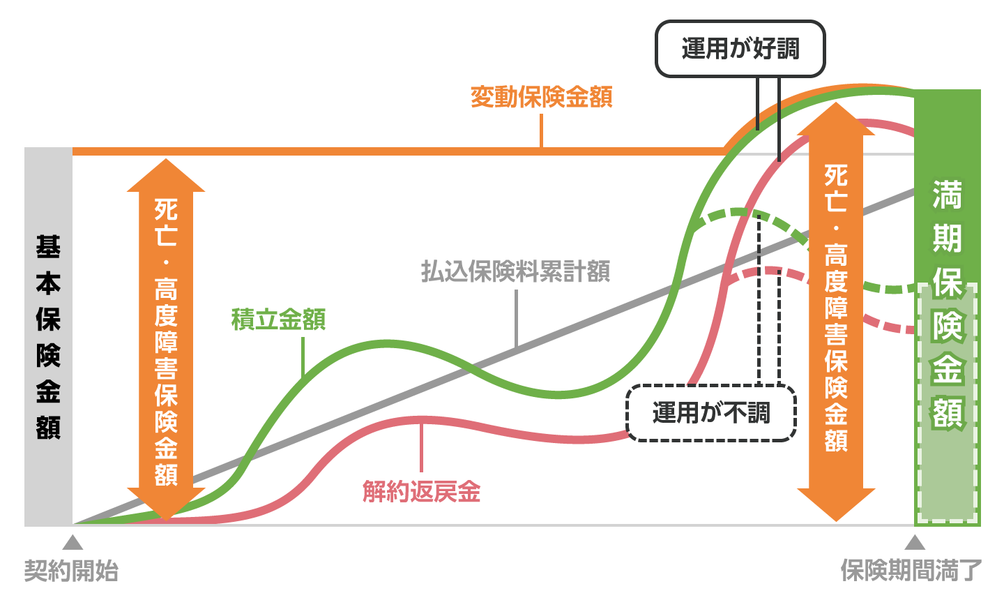 変額保険は、運用実績がよいときには受取額が増える一方で、よくない場合には元本割れのリスクがあります。