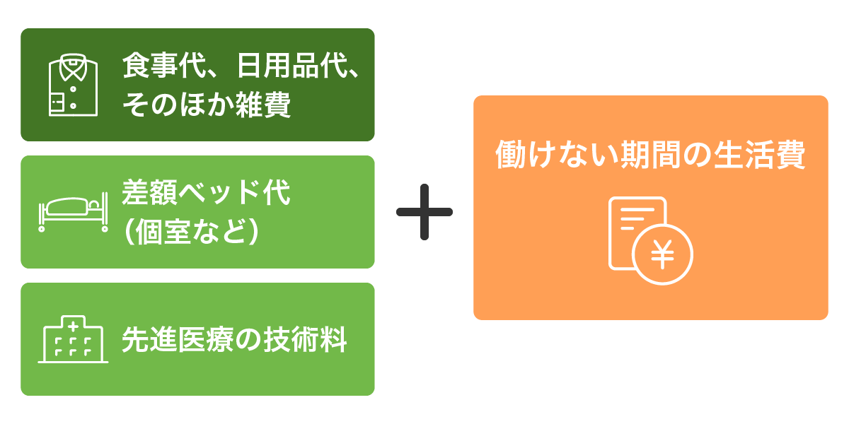 また、治療費とは別に、働けない期間の生活費への備えも重要です。入院などで働けない間は、収入が減少してしまいますが、その間も生活費はかかります。特に、会社員のような傷病手当金がない自営業者やフリーランスの方にとって、この生活費の備えは大切です。