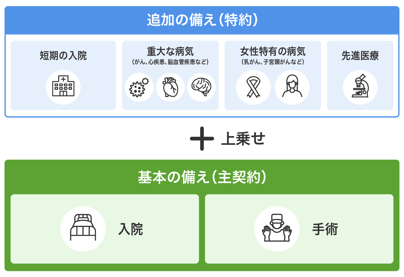 医療保険では、入院と手術に対する保障のほか、必要に応じて手厚い保障を追加できます。