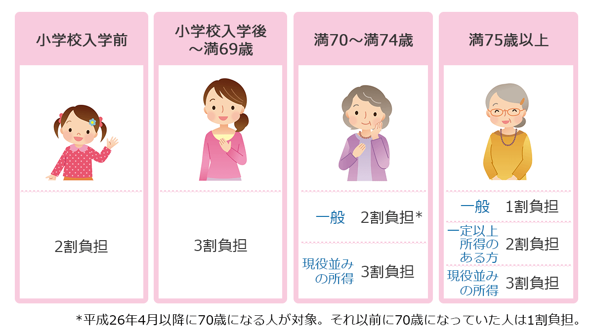 これらの給付に対して、小学校入学前の子どもはかかった医療費の2割、小学生以上70歳未満の人は3割、70歳以上75歳未満の人は2割(現役並み所得のある人は3割)、75歳以上の人は1割(一定以上所得のある人は2割・ 現役並み所得の人は3割)の自己負担金を医療機関で支払います。