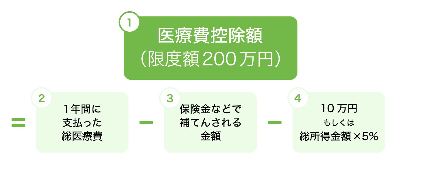 医療費控除額は、1年間に支払った総医療費から保険金などで補てんされた金額と、10万円もしくは所得金額の5%を差し引いた額です。