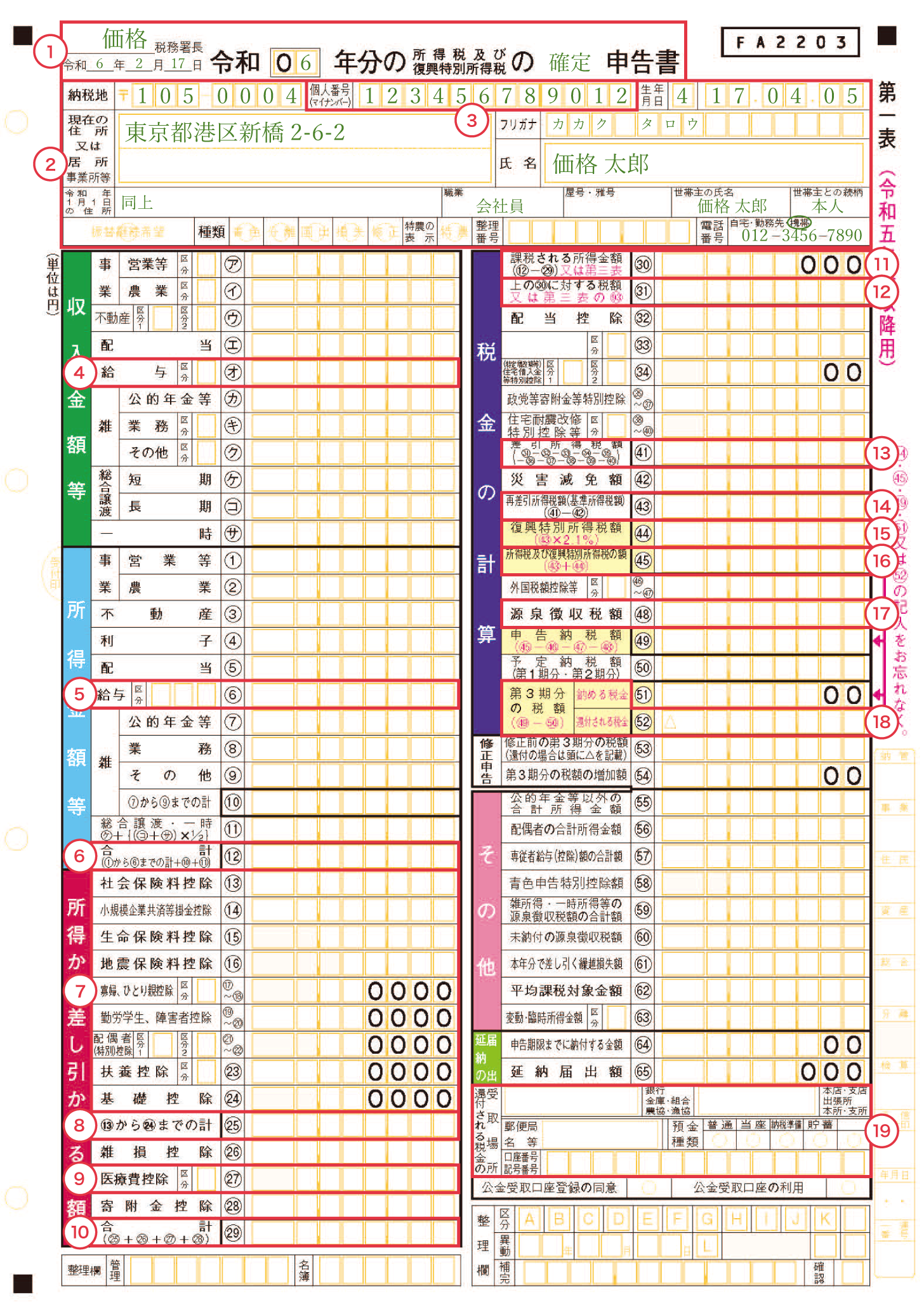 続いては、以下の図8、図9の記入見本を見ながら、確定申告書第一表、第二表に記入していきましょう。