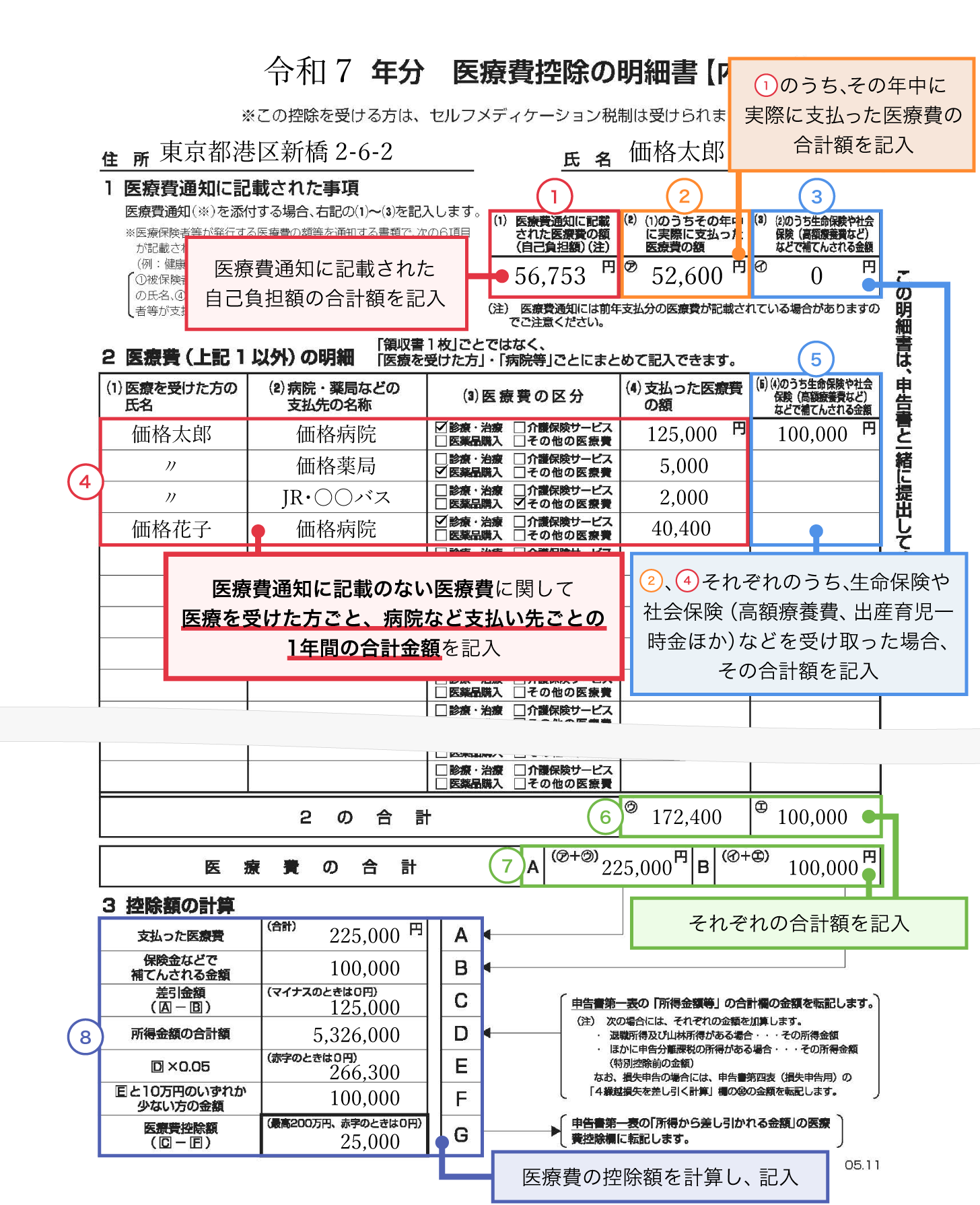 以下の図7の記入見本を見ながら、実際に医療費控除の明細書に記入しましょう。