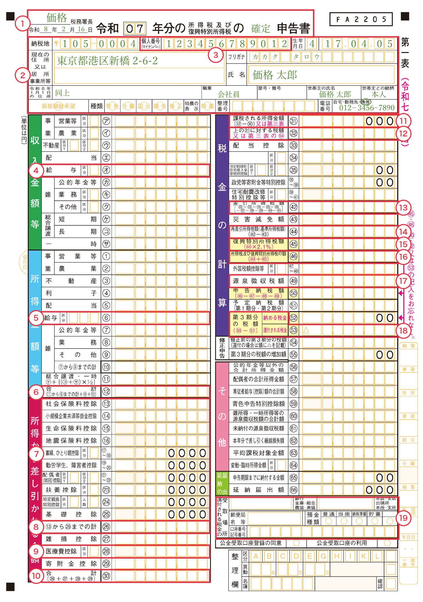 続いては、以下の図8、図9の記入見本を見ながら、確定申告書第一表、第二表(※)に記入していきましょう。