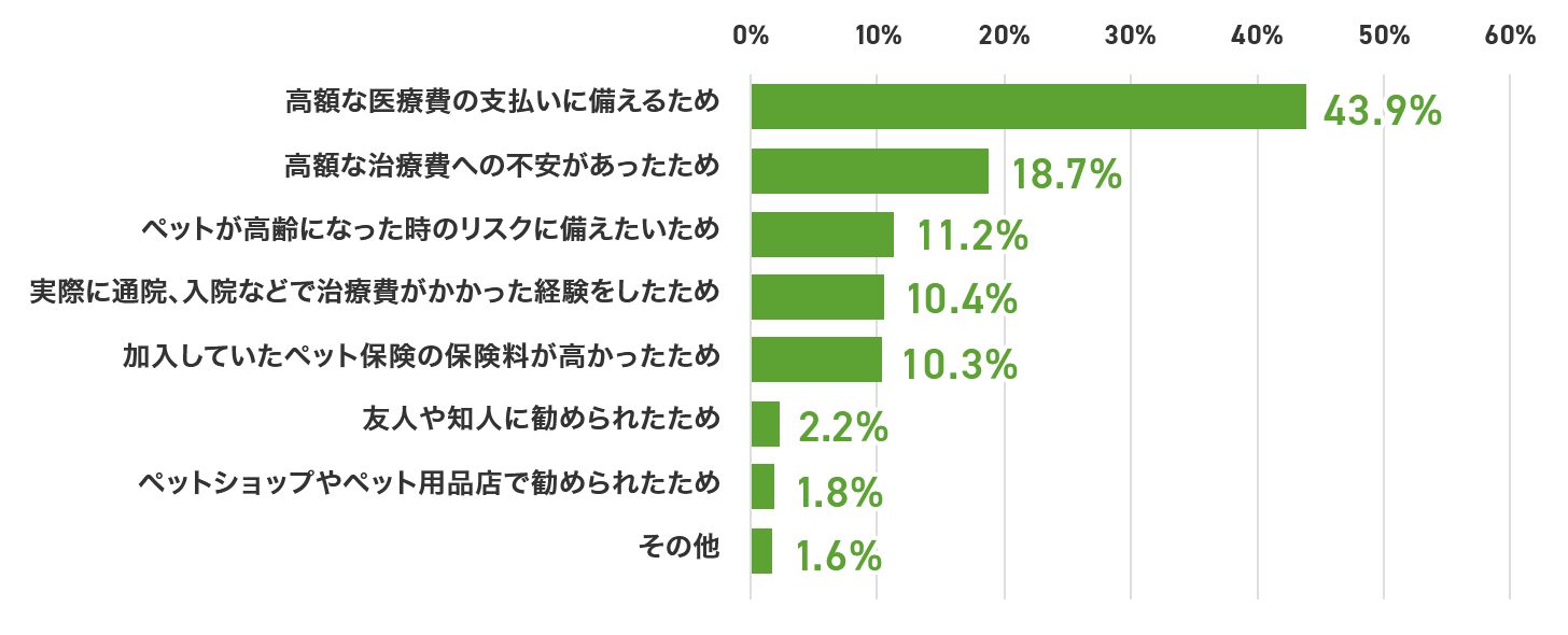 ペット保険に加入したきっかけは、「高額な治療費に備えるため」が43.9%で最多となりました。つづいて、「高額な治療費への不安があったため」が18.7%となっています。