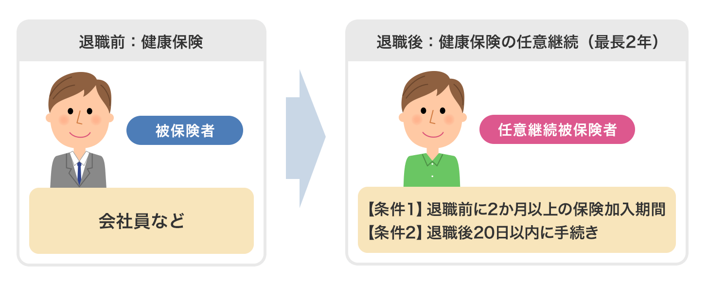 健康保険の任意継続とは、希望すれば退職後も引き続き退職前に加入していた健康保険に、任意継続被保険者として加入し続けられる制度です。ただし、加入できるのは2年間です。